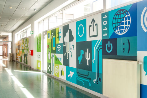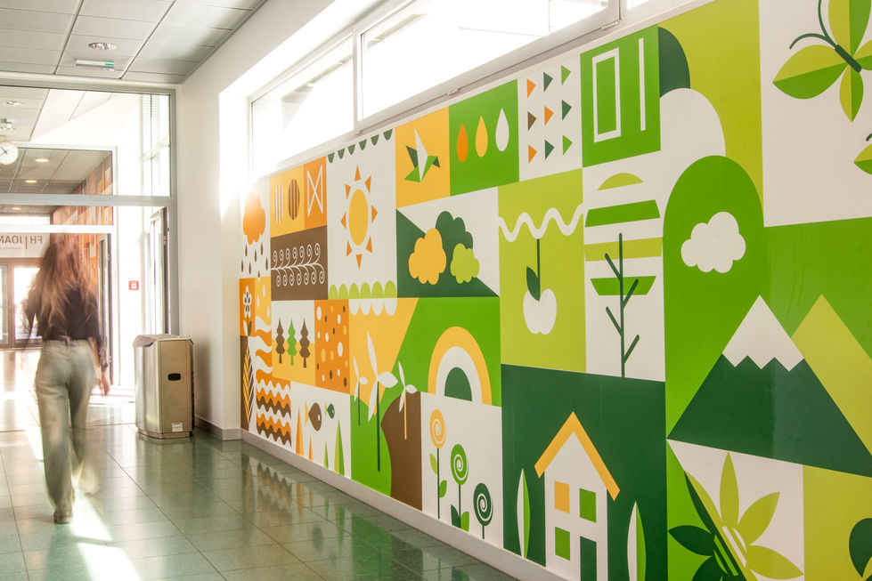 Während meines Masterstudiums an der FH JOANNEUM habe ich gemeinsam mit meinen Studienkolleginnen Melanie Bräuer und Laura Siller den Eingangsbereich des Hauptgebäudes neu gestaltet. Die Gestaltung entstand im Rahmen eines Wettbewerbs unseres Jahrgangs, bei dem sich unser Konzept durchsetzte und schließlich realisiert wurde. Unser Ziel war es, sowohl die Identität und das Studienangebot der Hochschule zu visualisieren als auch eine freundliche, lebhafte Atmosphäre zu schaffen.